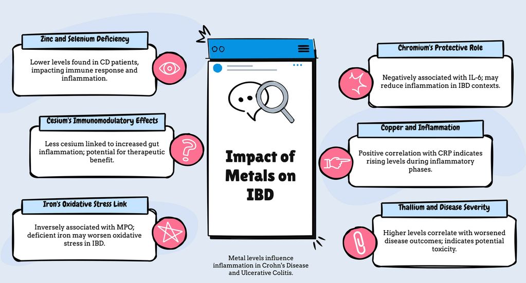 Amerikanou, C., Karavoltsos, S., Gioxari, A., Tagkouli, D., Sakellari, A., Papada, E., Kalogeropoulos, N., Forbes, A., & Kaliora, A. C. (2024). Clinical and inflammatory biomarkers of inflammatory bowel diseases are linked to plasma trace elements and toxic metals: New insights into an old concept. Frontiers in Immunology, 15, 1363006. https://doi.org/10.3389/fimmu.2024.1363006